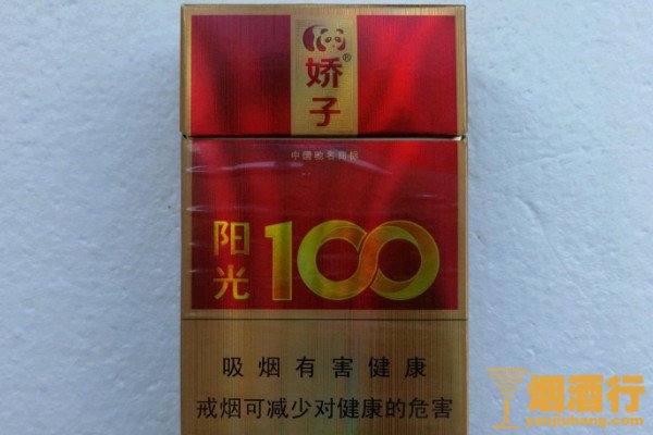 娇子阳光100外包装为经典的中国红颜色,搭配金色,使其喜庆中彰显奢华,整体设计风格简约,其中焦油含量为11毫克,烟气中的烟碱含量为1.1毫克。