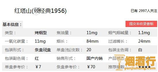 在了解了红塔山1956硬盒多少钱之后,为了大家能更详见的了解此烟,小编特意将红塔山香烟核心参数进行了整理,以便于对它进行更深入的了解。