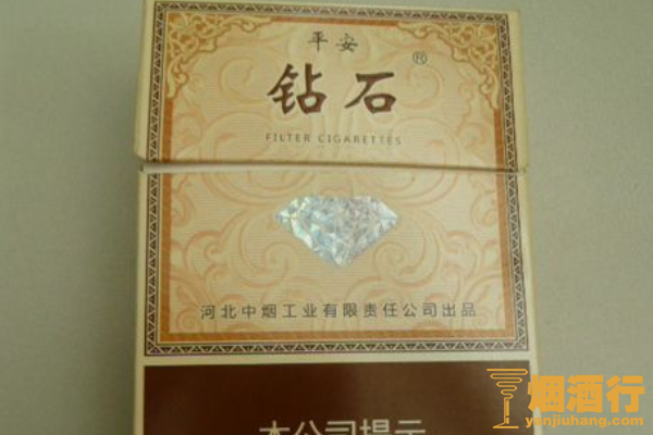 钻石(平安)是一款较为常见的钻石香烟,包装以褐色为主,正面的淡黄区域印有钻石标志,其口感顺滑,烟气饱满,带有一点酒香味,性价比很高。